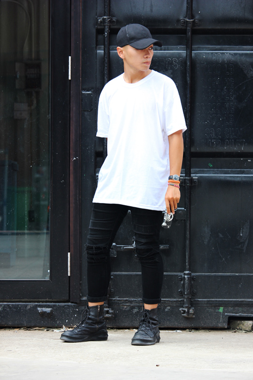 Xu hướng "đen toàn thân" vẫn luôn hot, hãy nhấn nhá cho bộ trang phục của mình một chút màu trắng để trông ấn tượng hơn. Ngoài ra, những chiếc áo phông dáng dài, có điểm nhấn là khóa kéo ở bên hông hiện nay cũng được nhiều bạn nam lựa chọn để làm cho bộ trang phục all black trở nên cá tính hơn.
